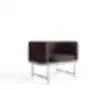 Modernus krėslas su tamsiai rudos spalvos audiniu ir elegantišku balto metalo rėmu – minimalistinis šiuolaikinis baldų dizaina.