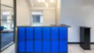Įmonės autentiškumas – vyraujantys mėlyno atspalvio akcentai, konferencijų bei poilsio erdvių kėdės, priimamojo baldų apšvietimas, akcentinė siena virtuvėje.